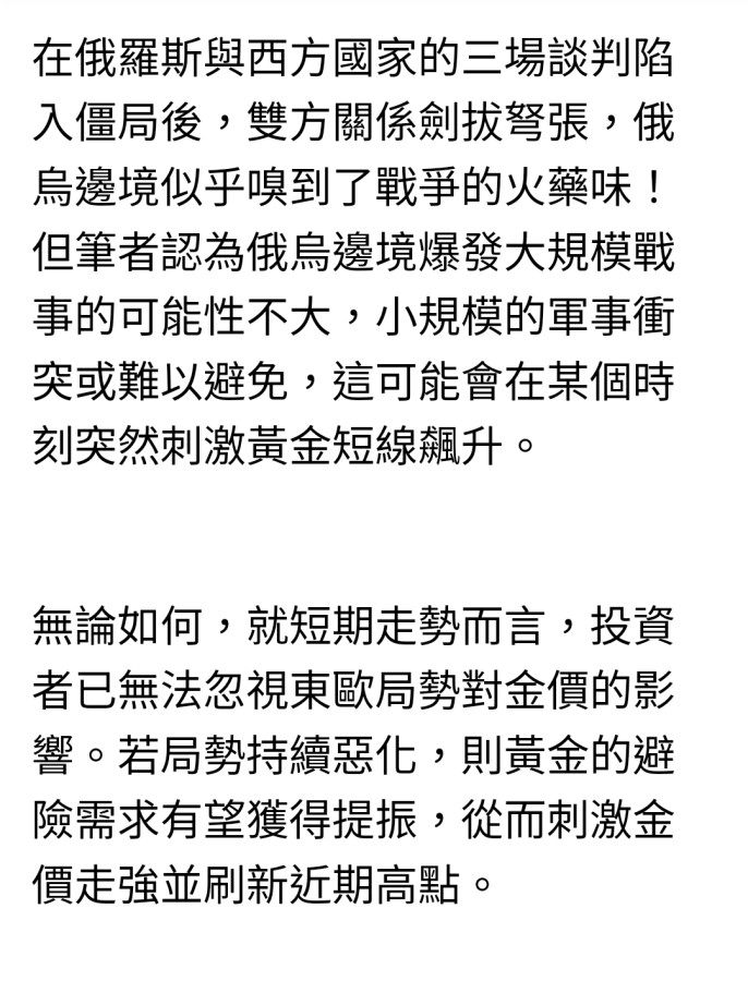 回覆 康康:美俄會談前,烏克蘭危機與金價應該都是膠著...