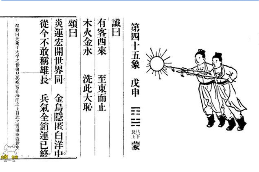 推背45西邊太陽諭不落國(美、西歐)。倆人同射太陽的倆人指中俄。