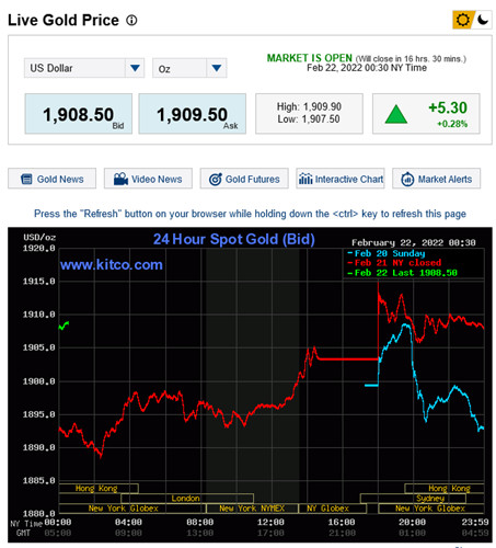 何以今日金價開盤爆增至高點後,持續盤桓於1906~1911區間呢?只因各國仍對和平仍存一絲希望。雖然普丁宣布承認頓巴斯獨立,隨即派軍進入烏東地區進行「維和」行動,實際破壞烏克蘭主權,並已超越美國宣稱不容許俄羅斯軍隊入侵烏克蘭一吋領土的底線,戰爭氣氛更加濃烈,都在觀望臺北時間下午4時歐洲市場開盤結果。