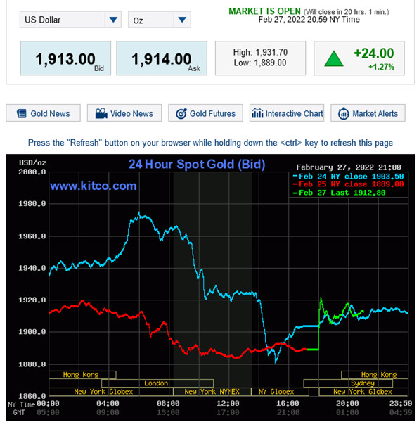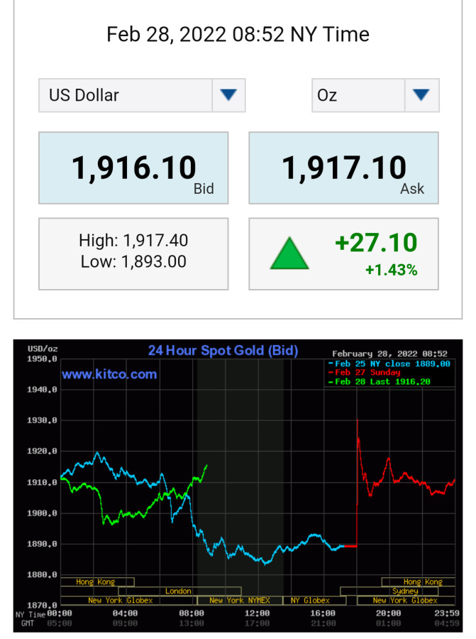 關鍵是今天 (2月28日) 早晨7點開盤後,黃金從上週收盤價大幅跳空直上1928.81開盤,不僅超越了上週跌落最低點1880.64後反彈波高點1921.24,直接跳空接近40美元,幅度相當於 2.1%,表示經過週末2天的沈澱後,因戰事持續擴大並提升為核戰等級引發高度恐慌,等待進場的多頭需求極高,直接撐竿跳空大幅超過前波反彈幅度,形成一支可頂住空頭打壓的避雷針,即今日收盤前空方必須打壓今日開盤高點,下拉至1849,75以下,才可能完全破壞多方需求動能的力量。如果下跌時間每多一天,破壞線型趨勢的效能就遞減一半。
