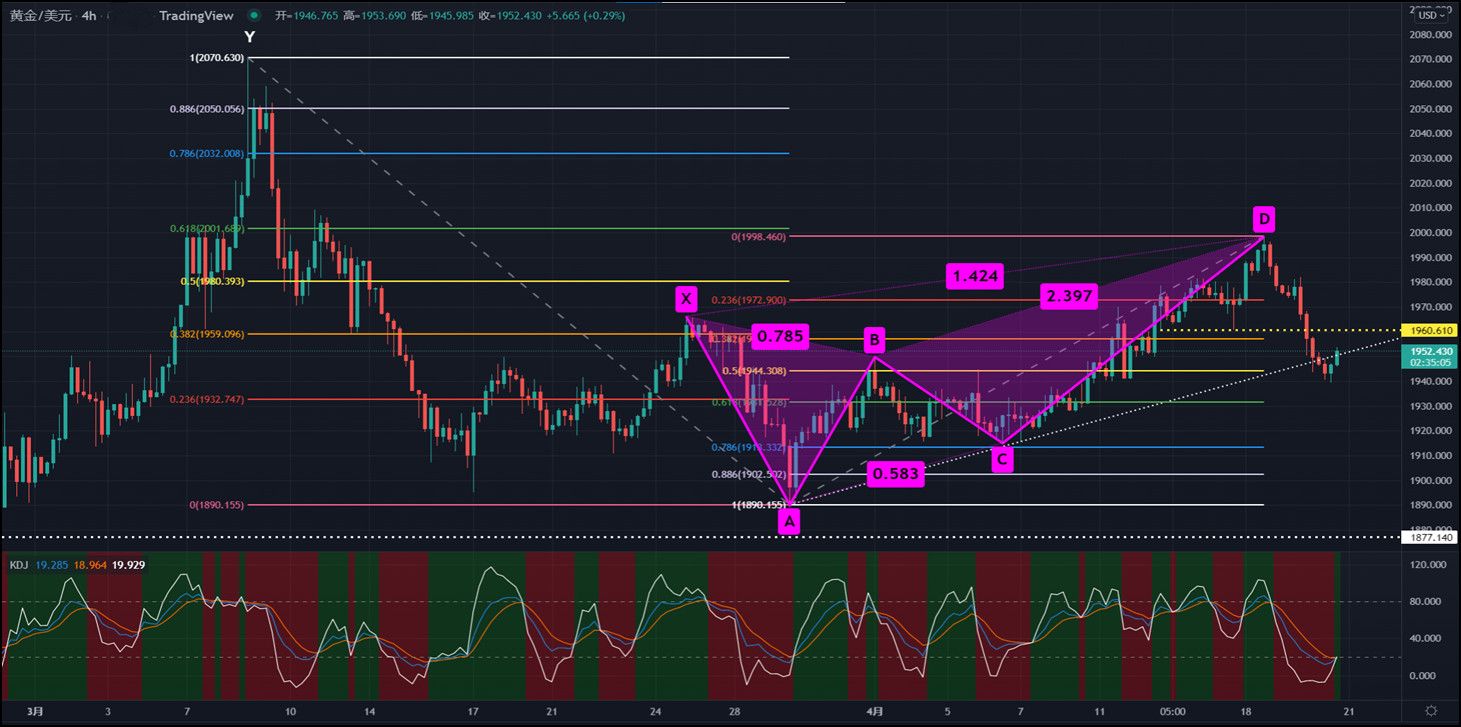 黃金的四小時圖顯示,價格於3月24日觸及1966(X點)後急劇下挫至1890(3月29日低點,A點),隨後行情震盪上揚,於4月18日最高上探1998(D點),創逾一個月新高后承壓回落,構成了兩組斜波模式: