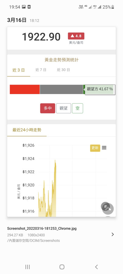台灣銀行的黃金存摺,與國際市場連動,只是美元經常會慢半拍。晚上可交易到10點鐘,我搶到最後一盤,今天最低價1921.7!