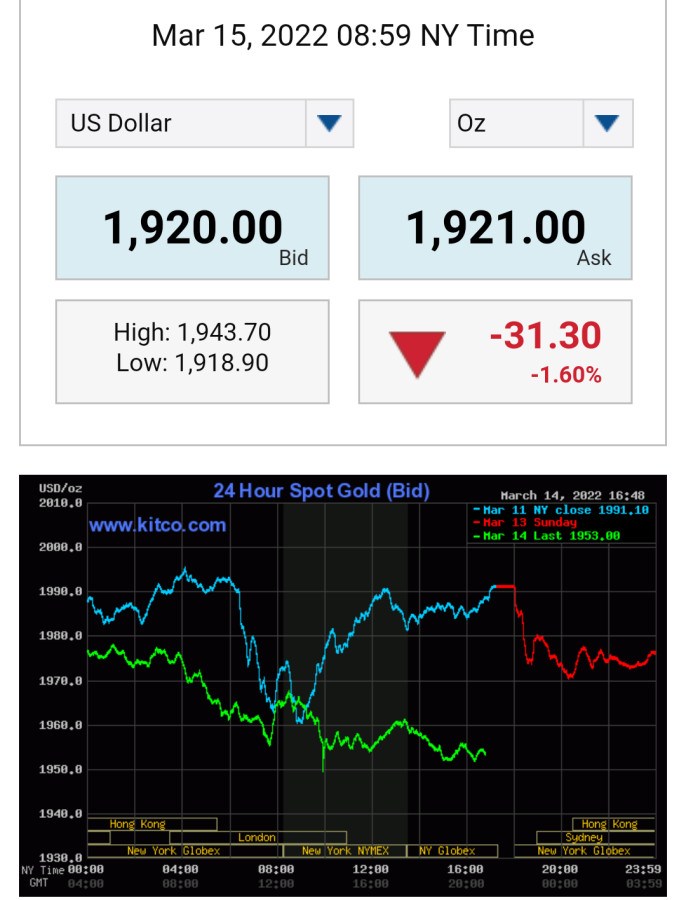 本週前兩日金價,延續自上週三(3月9日)自2060附近持續下墜的走勢,從3月14日開盤後的1988.5,至台北時間3月15日晚間10點30~40分,一路跌破1910美元,最低至1907.43。