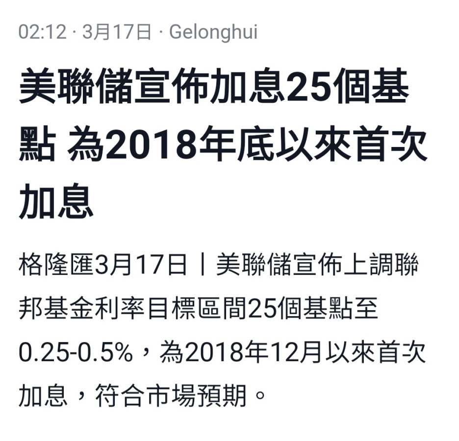 上週末公布的2月份美國消費者物價指數 (CPI) ,再次大幅超越1月份較去年同期年增率7.5%,達到1982年2月有紀錄以來的最大年增幅7.9%,直逼前兩次石油危機停滯性通膨危機所面臨的滯脹困境。因此,聯準會利率有可能: