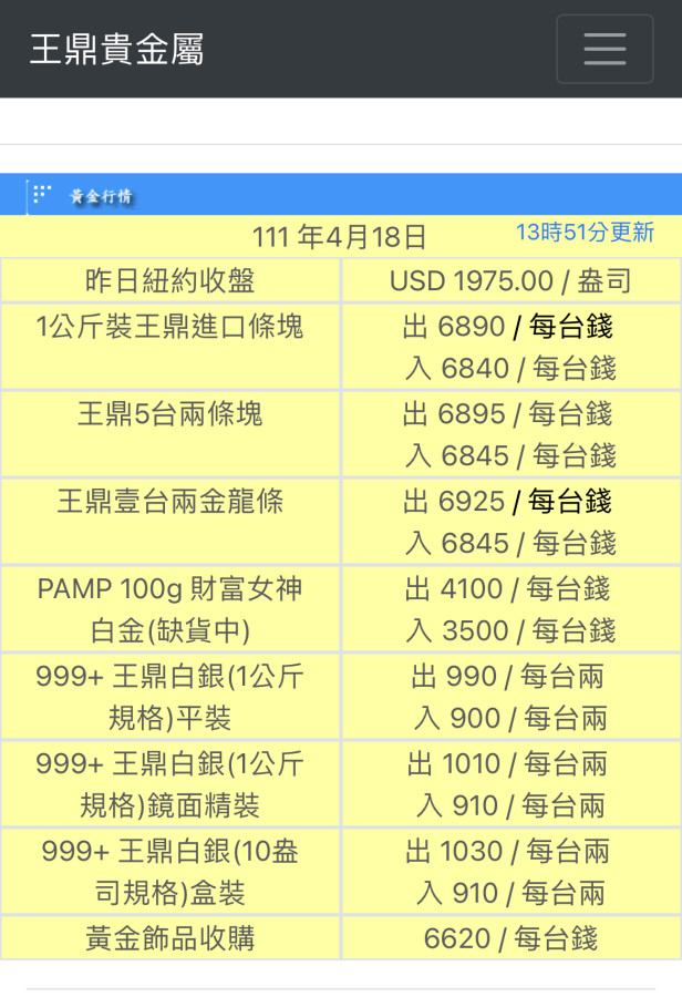 今日貴金屬公司 6750 /錢品牌五兩金條回收價$ 337500 /條