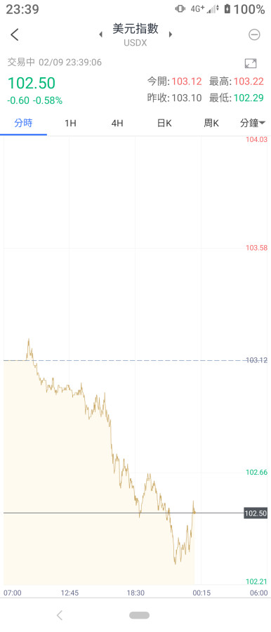 但美元指數早上103.12左右,但現在23:39已跌到102.5.