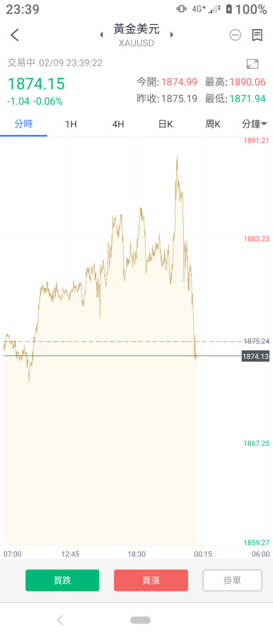 金金早上9:00左右黃金大約1873,但現在23:39又回到1873左右(起點).