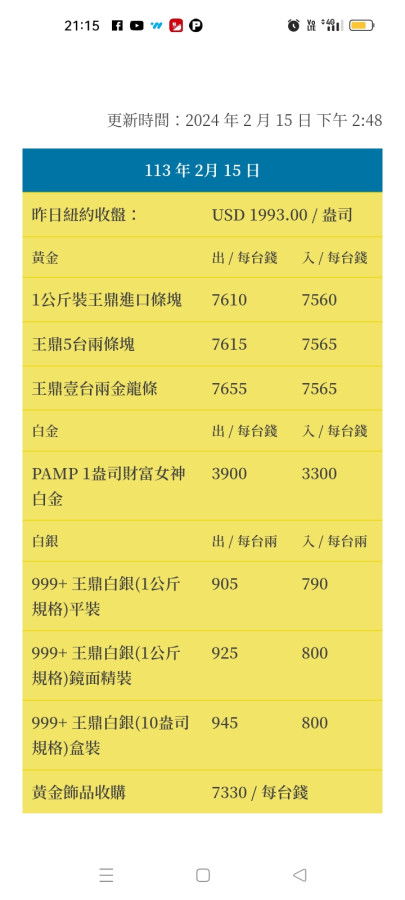 回覆 alisonli5168:好ㄟ!等待11點貴金屬公佈價格。...