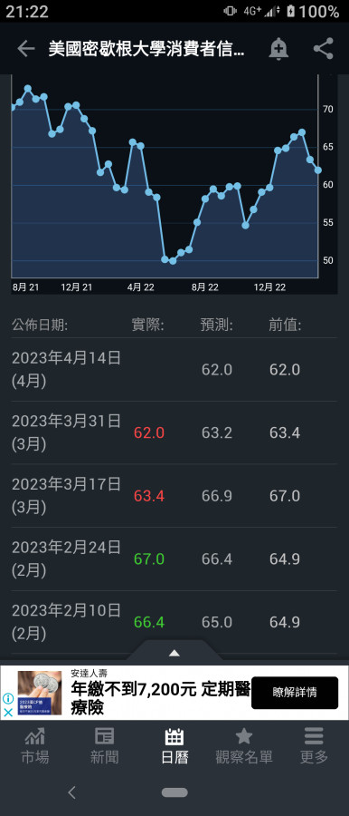 我猜4/14,22點公佈密歇根大學消費者信心指數比預期的好,因為2月67跌到62差距這麼大,這次的預期一樣62,很容易好於預期😜.