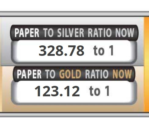 也就是說若發行機構手上各有1盎司的黃金和白銀當要被兌現時則每1盎司的紙黃金的購買者會有123.12個人要來搶這1盎司的黃金而紙白銀則會有328.78個人來搶