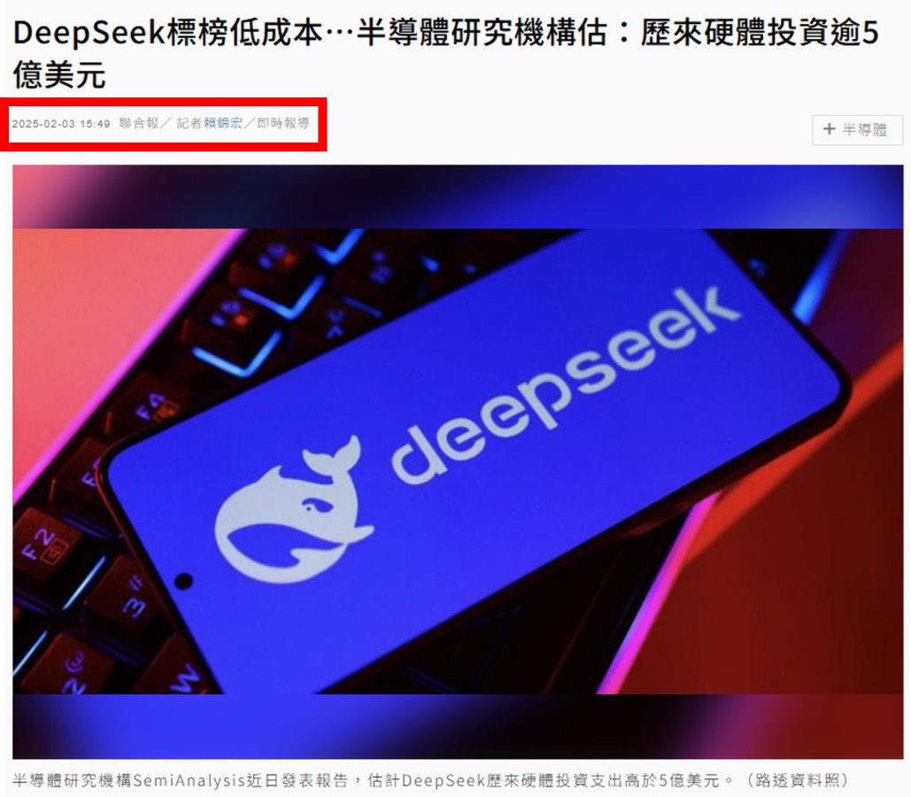 到了今(2025)年2月初,媒體才開始炒DeepSeek成本很低很厲害,
