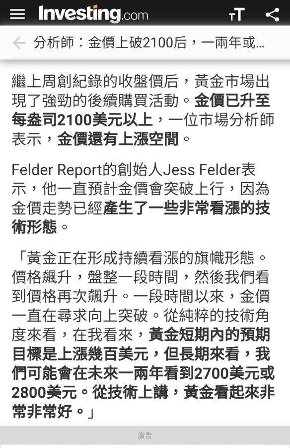 分析師:金價上破2100后,一兩年或看到2700或2800