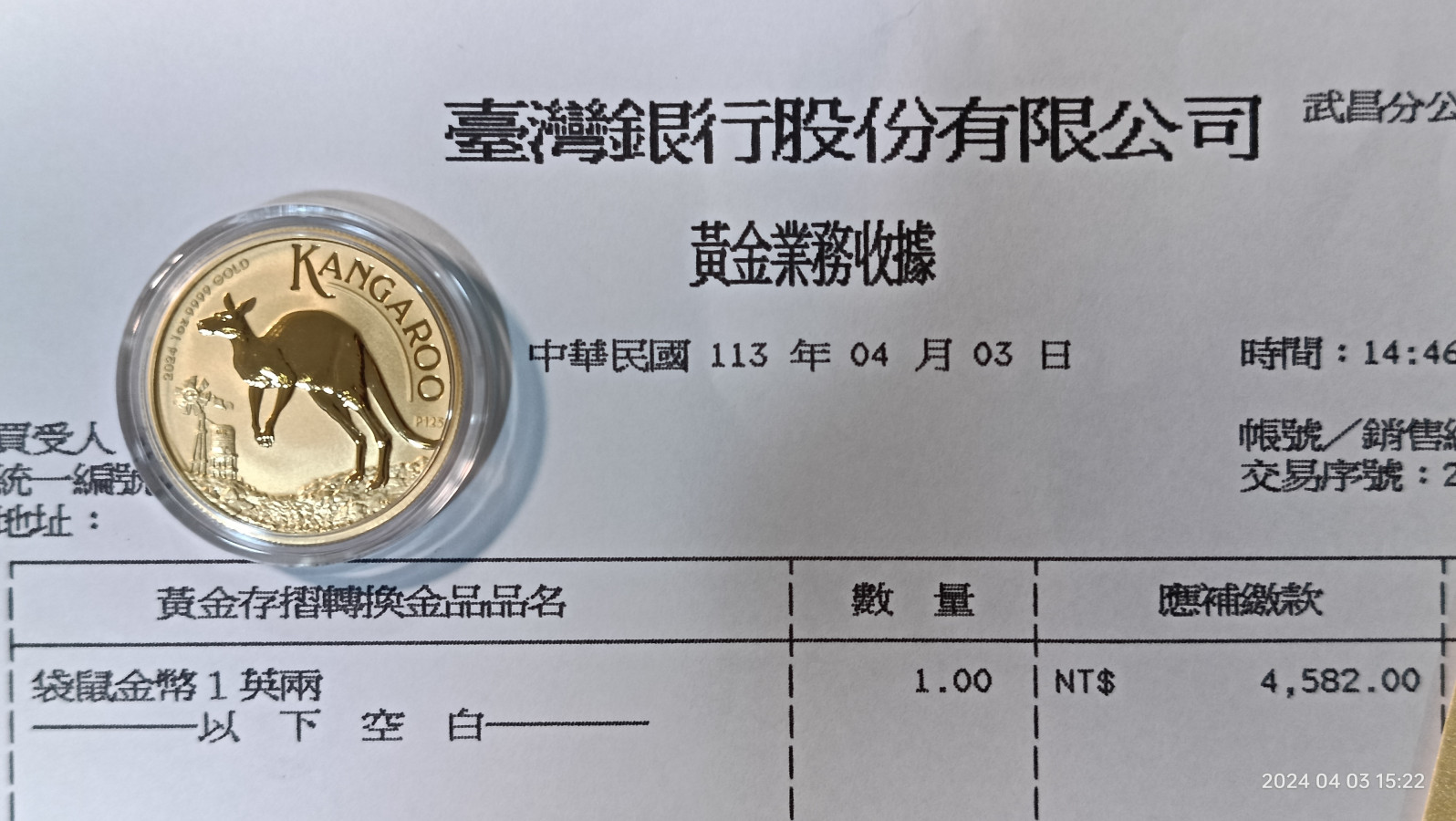 有圖有真相-台銀黃金存摺換購2024袋鼠金幣一枚低成本扣抵高牌價金額後, 金摺平均成本更低了如果金價續高, 金幣價格將同步上揚, 錢, 一直都在, 該漲的, 不會欠您比這時候高價入手實體黃金, 風險低很多後學操作模式, 僅供參考