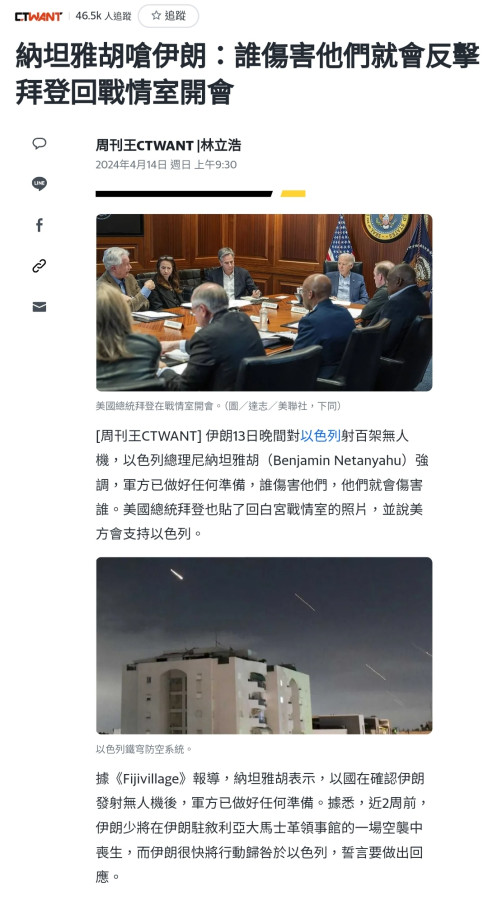 以色列即將對伊朗本土報復 美國拜登與內塔尼亞胡通話美軍將不參戰 以色列週一將打擊伊朗本土目標.....