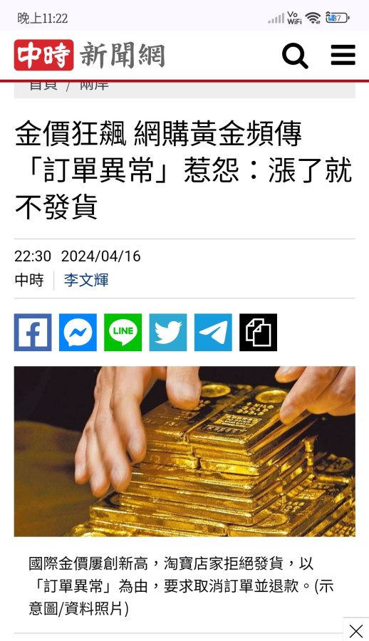回覆 yesk:台灣網購黃金就容易遇到大漲不認賬。...