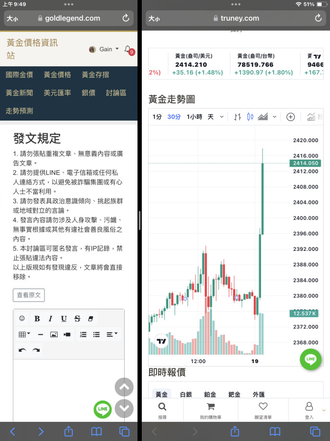 銀樓與貴金屬業者這兩天都不跌在等著金價漲了,今天若再站不上2400甚至連摸都摸不到的話,那這個週末確實會令眾人難熬啊!