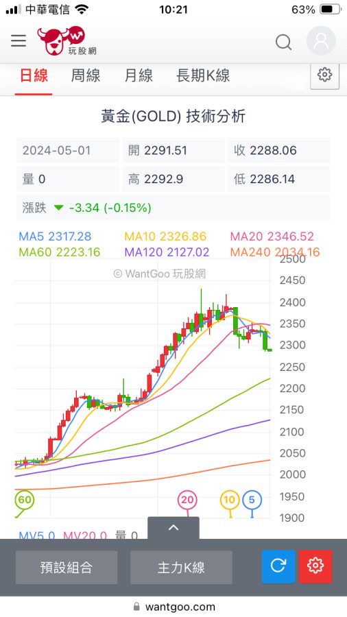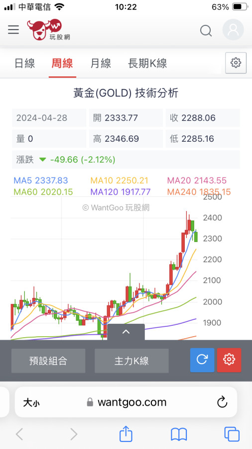 就是要下去了啊 黃金近期的走勢很像股票 利多而大漲 衝不上去前面一次2300就要下來了 一看就知道很多大戶硬護著 這次就撐不住了 反正黃金就是穩 下去也只是波段整理 跌不到多低