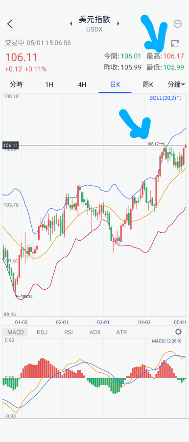 剛剛美元指數碰觸到前一次的頂點106.17