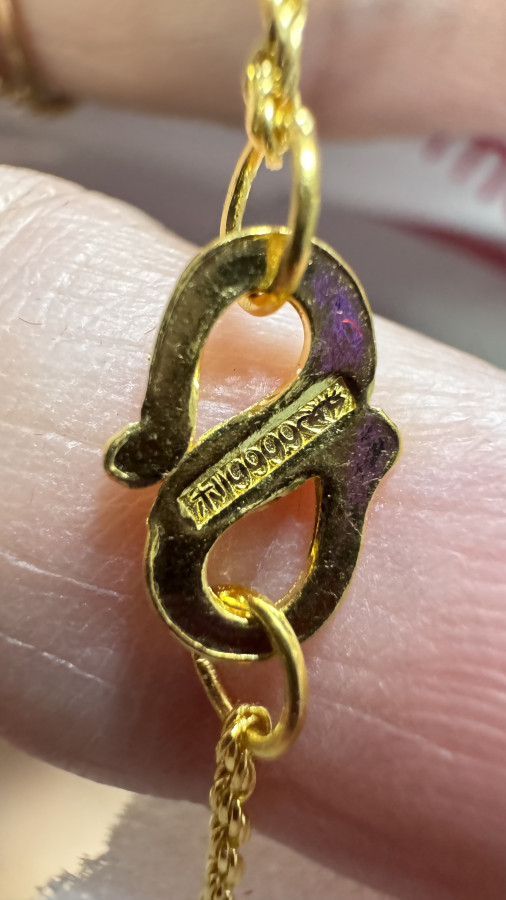 剛剛拿去銀樓問老闆說項鍊是黃金,可能是我拍的燈光問題,另一個是黃金奶嘴她就沒有肯定,說可能是硬金材質,因為還包著保鮮膜,1.11錢,12619元。