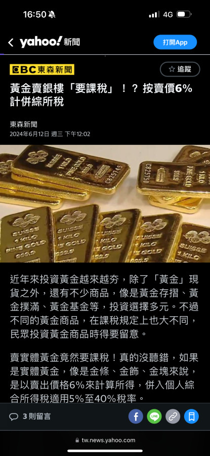 如果政府完全掌握了你財物的資料 當然它想收稅 你也沒轍 就像如今對銀行利息所得扣健保補充費一樣 不繳不行 因你的利息所得被它掌握了 但買賣金金這等資料 是不會給政府知道 法律現在也沒依據可抽稅 除非是黃金存摺 這每筆都有記錄 這就留下 金流 那一天 它 缺錢 你就可能 糟殃!目前 安啦!咱小錢它不會打你的算盤ㄟ