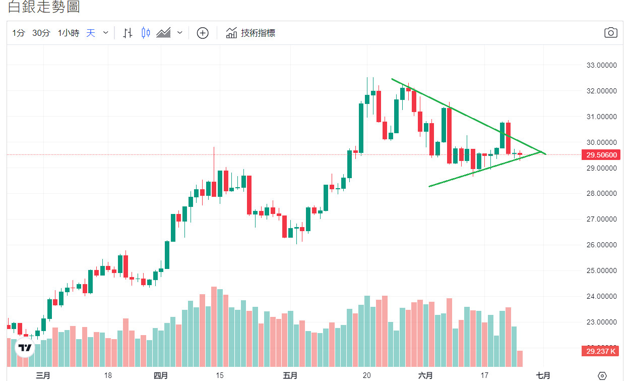 如圖,白銀已走到了三角收斂區域的尾端,接下來會往上還是往下突破呢?