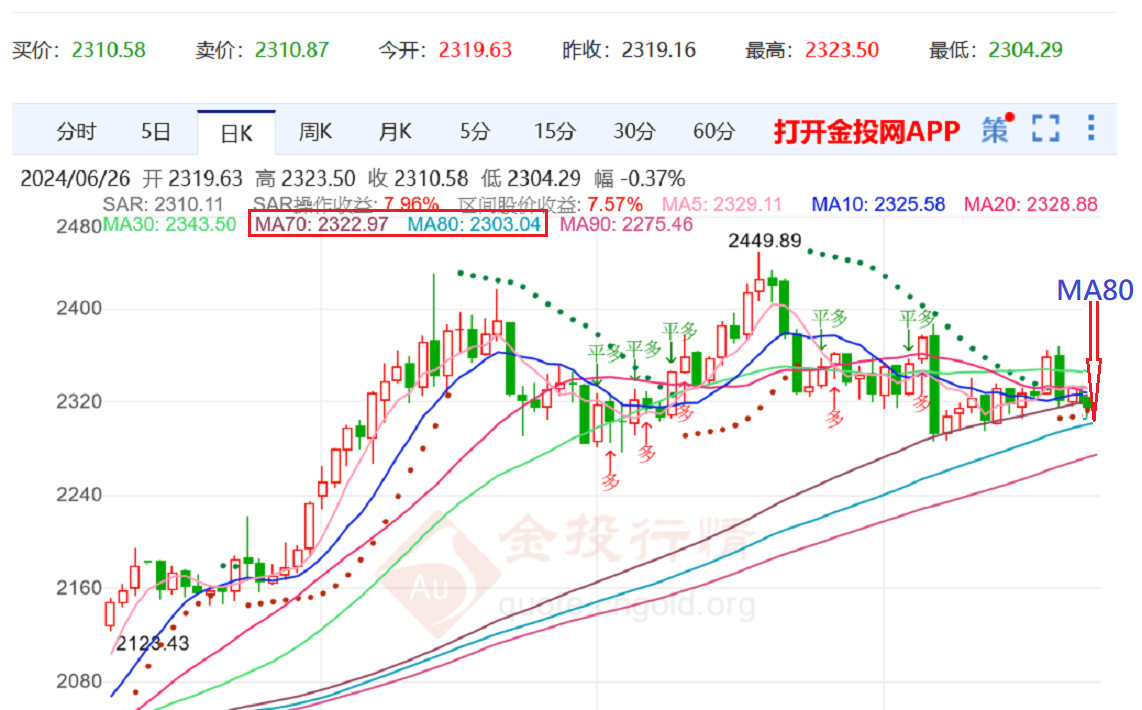 表面上金價K線圖MA值由70MA~下跌~80MA