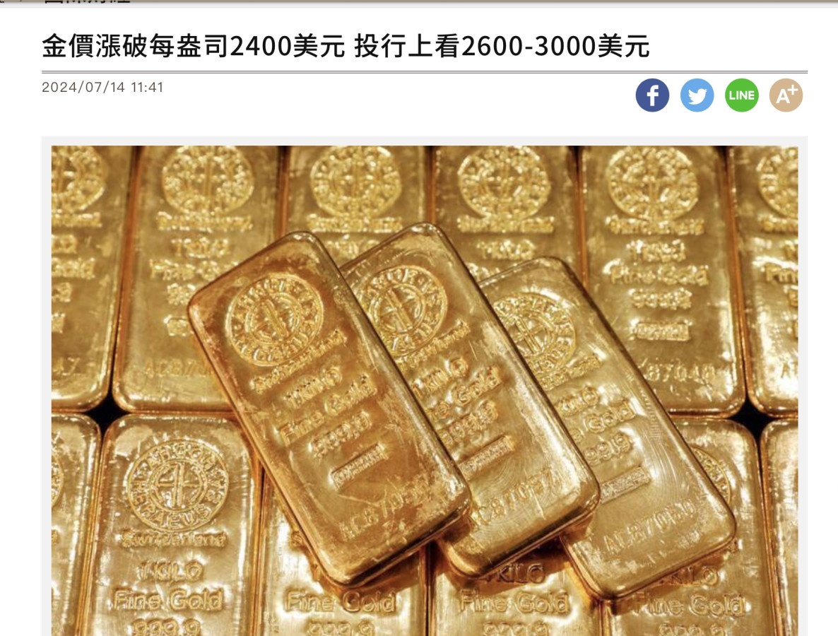 〔記者張慧雯/台北報導〕受到美國經濟數據逐漸弱之際,美聯準會主席鮑爾表示利率政策必須同時考量通膨與就業市場的雙邊風險,並表示通膨具有滯後性,降息並不需要等待通膨回到2%門檻,市場對於9月降息的信心更為充足,金價突破每盎司2400美元、持穩於高檔。
