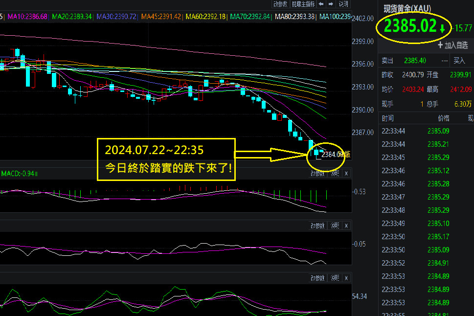 跌至7/22(一)收盤時之最低價:2383美元/盎司
