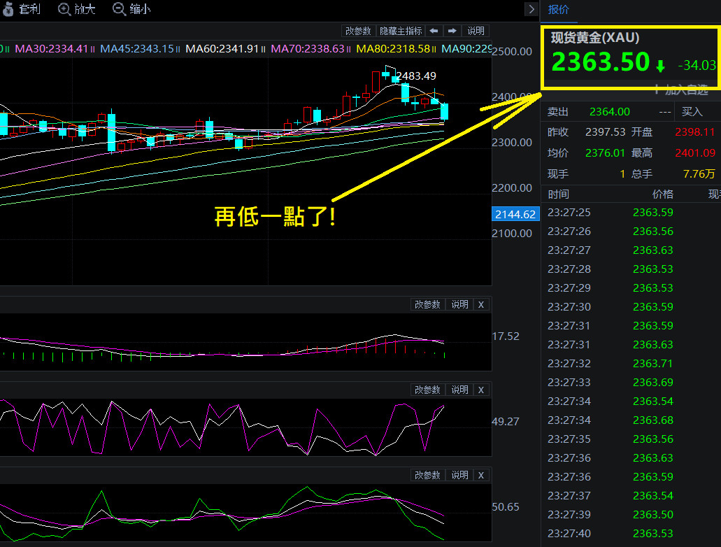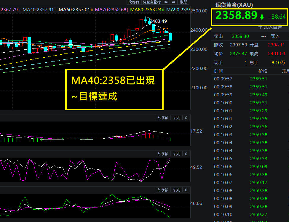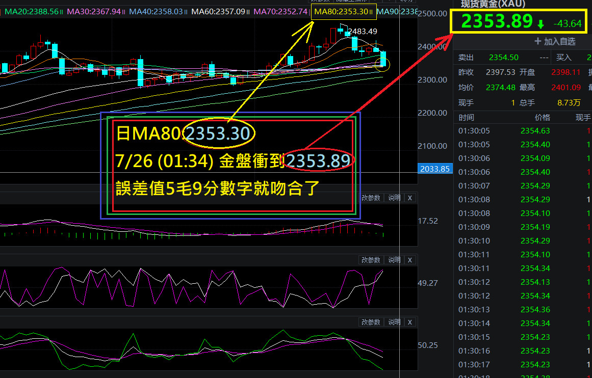 7/25(21:35) k棒終於往下穿越MA20(2389)碰觸MA30(2368)