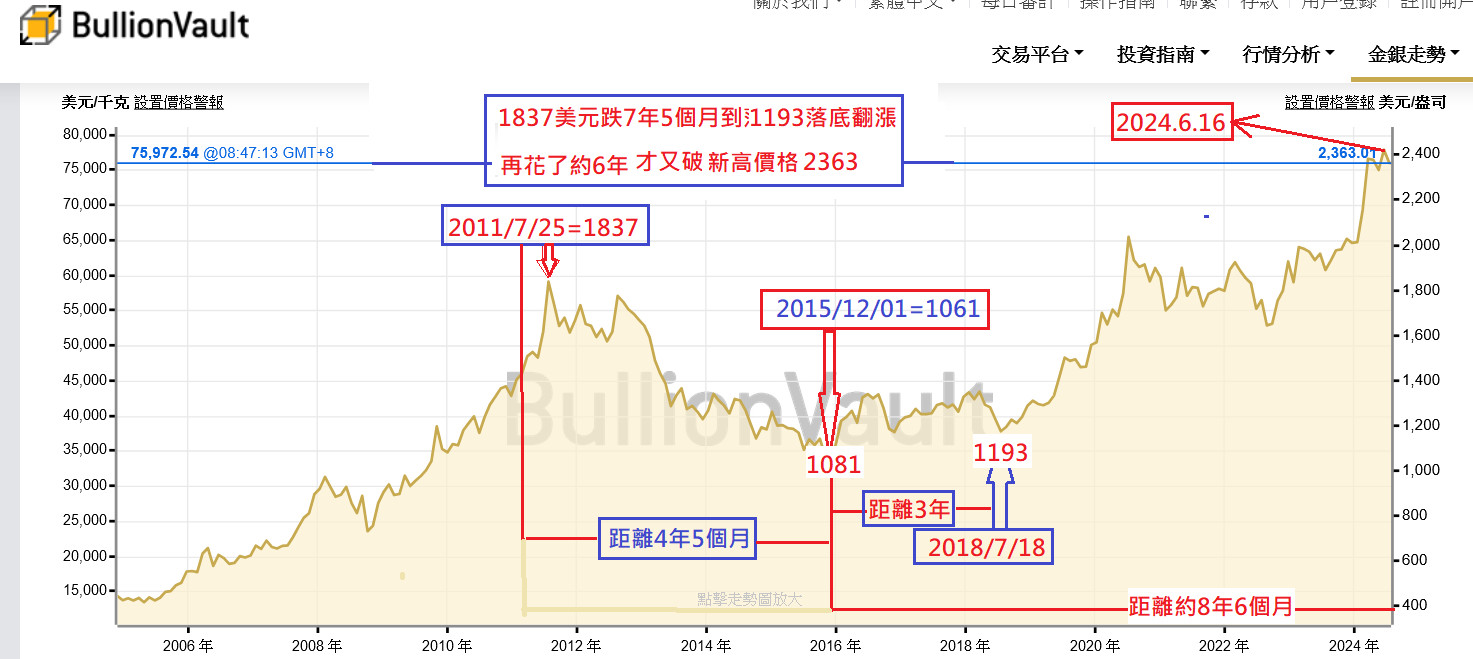 D=好多幾年前的~陸大媽事件(全民瘋搶黃金潮)>黃金盤破新高後>大崩盤場景:前一次(陸大媽~全民進場買黃金)之時是>破新高後在往回跌時>一貫破MA100之後就墜崖式崩盤跌回1000美元/盎司>陸大媽套了約10年之後才解套