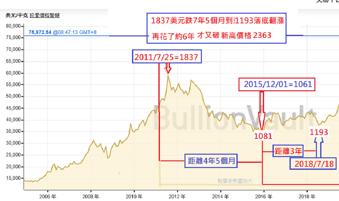 黃金之前歷史>破新高價後~用4~7年回跌落底=蓄積動能