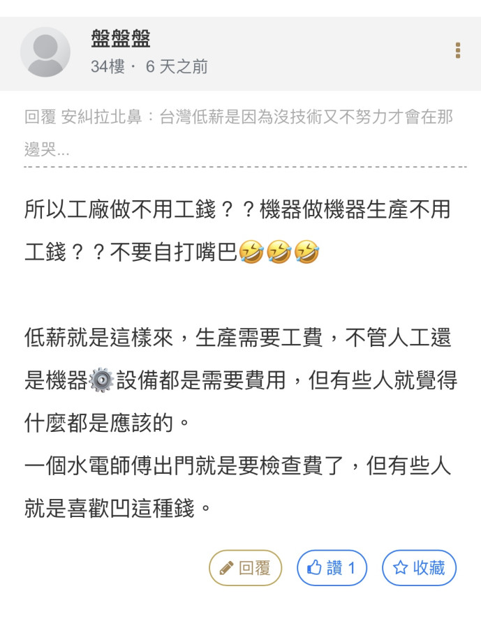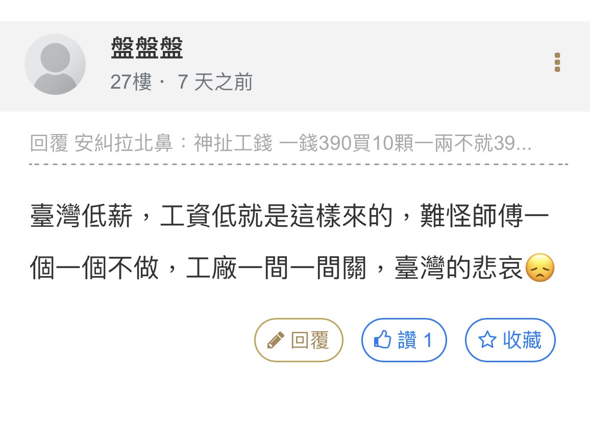 做生意本來就是低買高賣賺利潤 說有房租水電人事囤貨等成本那ok 但今天你商品既然不是純手工製作 也只是叫貨而已 就不要一直在說工人怎樣 徒弟帶師傅那種鬼話 你們銀樓說的工錢也是進你們銀樓自己的口袋也不是進到那些工廠工人的口袋 拜託真的不要胡扯到自己想賺的利潤硬嘴到工人身上