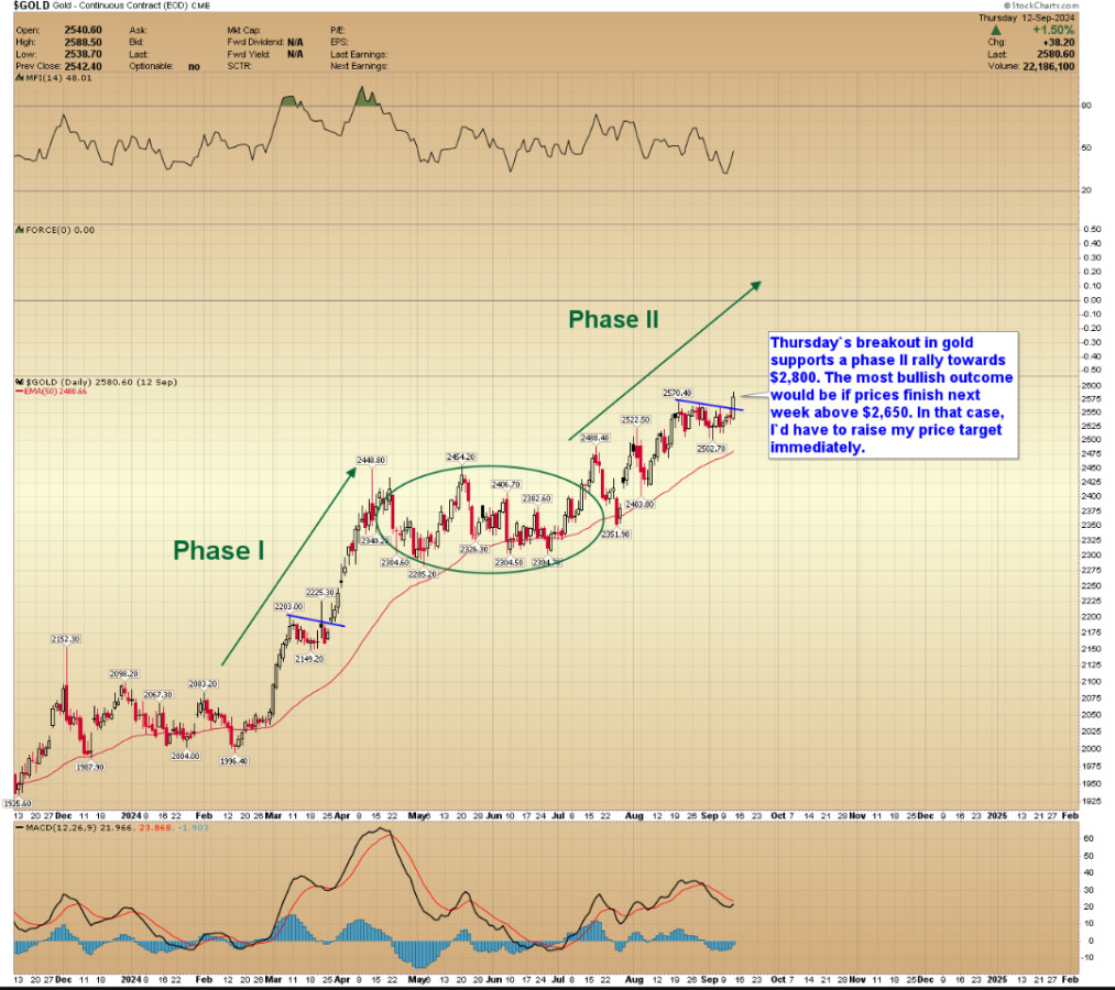 Thursday’s breakout in gold supports a phase II rally towards $2,800. The most bullish outcome would be if prices finish next week above $2,650. In that case, I’d have to raise my price target closer to $3,000 immediately.