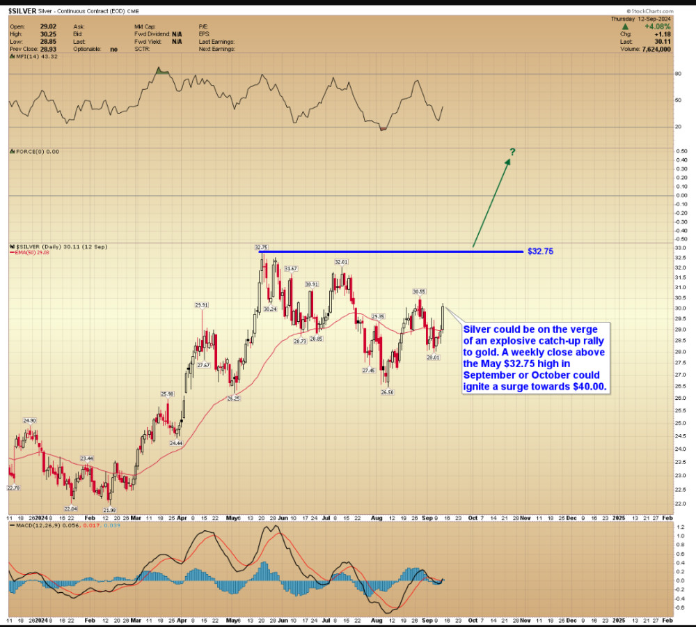 Silver could be on the verge of an explosive catch-up rally to gold. A weekly close above the May $32.75 high in September or October could ignite a surge towards $40.00.