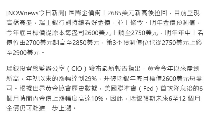 瑞銀對黃金繼續看好,並上調對金價的預期,將2024年年底目標價由2600美元上調至 2750美元,2025年年中由2700美元調高至2850美元。