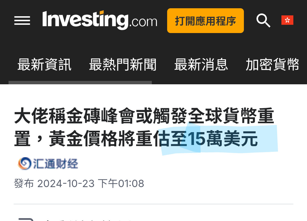 大家好,以下是一些您可能會感興趣的東西: 全球金融重置即將到來,在新的體系下,黃金可能被重估至每盎司15萬美元。他補充稱,本周的金磚國家年度峰會可能是潛在的觸發因素