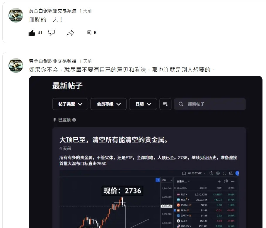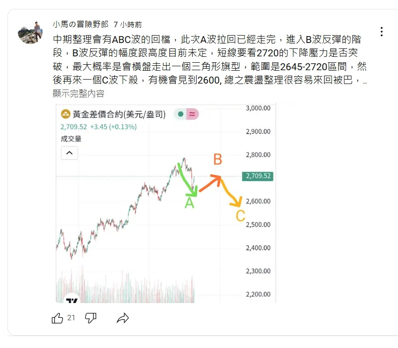 2024/10/21版上Gain大大分享過的黃金白銀職業交易頻道昨天發文說大頂已至, 接下來會跌到2550.