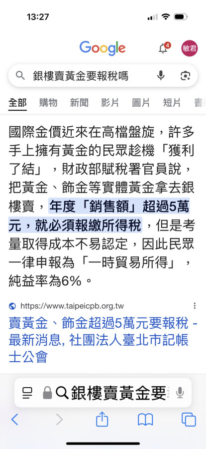 3.理論上,從台銀換取或提領的實金,拿到坊間出售,除非對方有要登記相關資料,你的買賣紀錄才會上傳給國稅局併計入所得。
