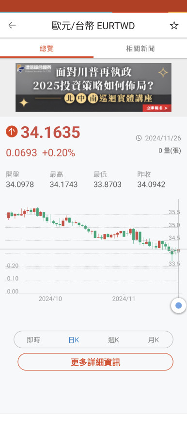 本來以為歐元跌破34可以買了, 結果真的是止住跌勢了, 感覺新台幣還是穩一點!