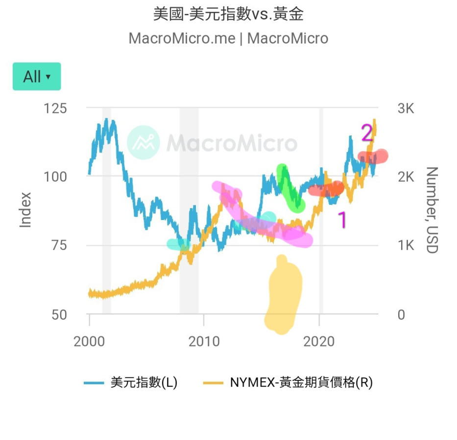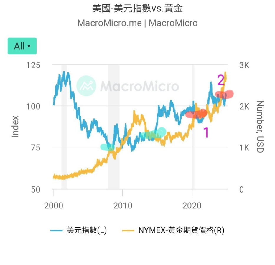 2. 同為國際儲備與避險工具,具有一定替代關係,美元走強會削弱黃金需求,反之亦同。