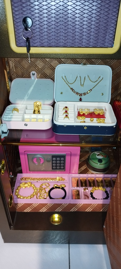 現金太多 保險箱裡面多一個現金保險箱 黃金賣一些 內容物又變化了 等再買10幾兩王鼎一兩金條 格局再換 好幾樣3D硬金 貔貅招財十幾隻 工錢貴 賣銀樓只能算飾金 幸好漂亮大款 特殊場合非常炫