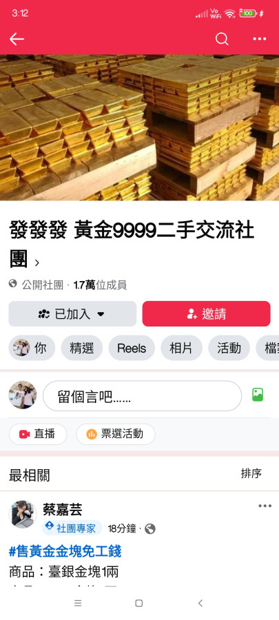 寶琳銀樓 老闆臉書有個黃金買賣社團 發發發 999黃金買賣 偶爾會有些特殊黃金可以買