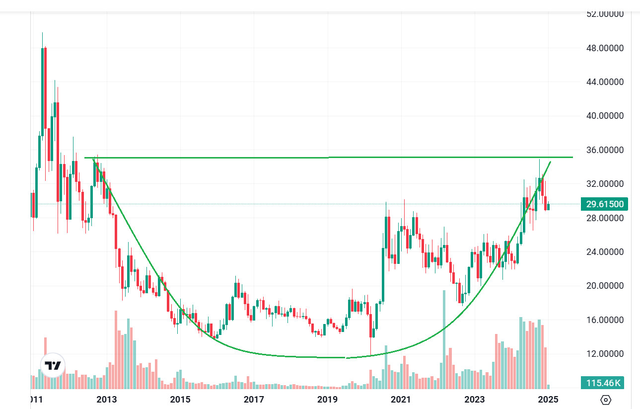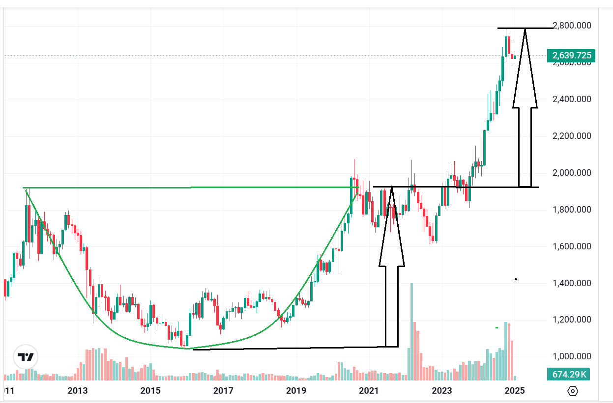 接下來看圖3,白銀經過了約12年,也完成了大碗公底部,接下來會怎麼走呢? 到2029年再來看看吧!!😅