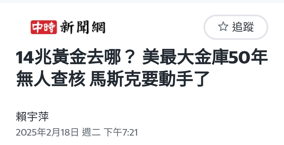 正在進行「史詩級查帳」的馬斯克會把目光放在諾克斯堡,整起事件的開端始於知名財經部落格ZeroHedge在X上發文,並標註馬斯克,文中指出諾克斯堡有4580噸的黃金,而最近一次審查是在50年前的1974年。貼文建議馬斯克對諾克斯堡進行審查,以確保黃金完好無缺。