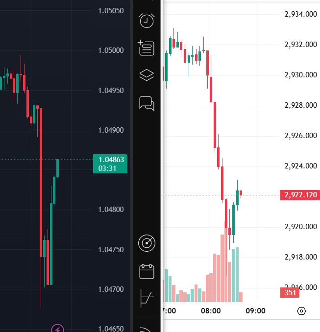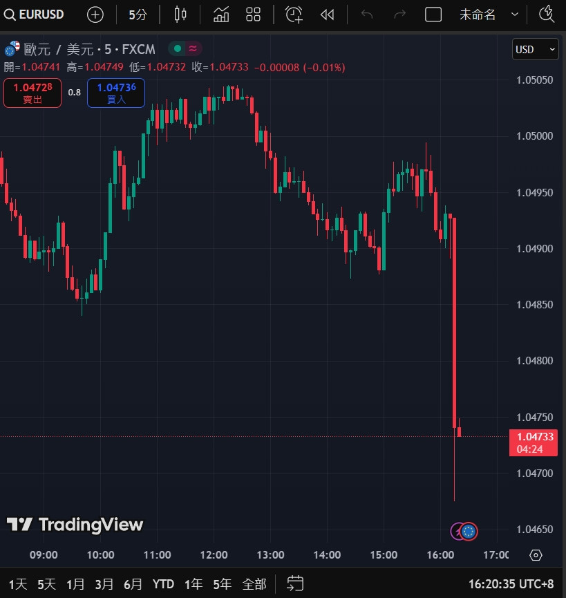 歐元對美元 五分鐘內掉了0.02(200點), 黃金掉了20元