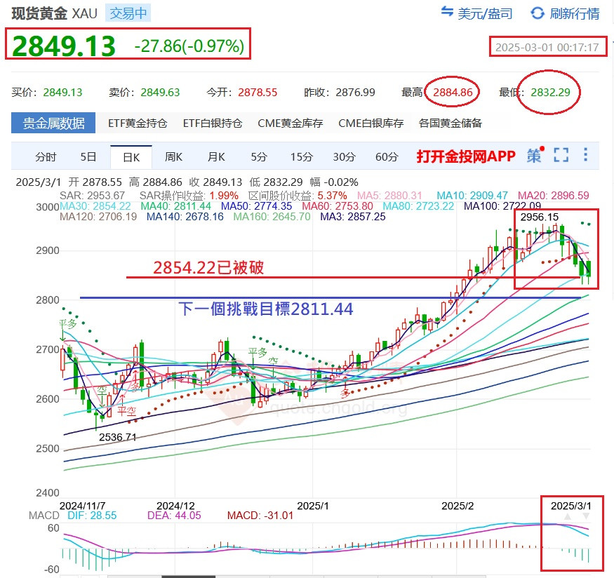 金金又挫屎了!MA30(2854.22被攻破=層層後退~等待MA40支撐抵抗