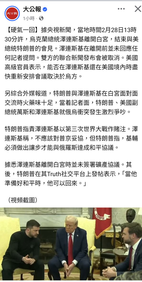 白宮爆激烈爭吵 川普警告澤倫斯基「在賭世界第三次大戰」礦產協議未簽署