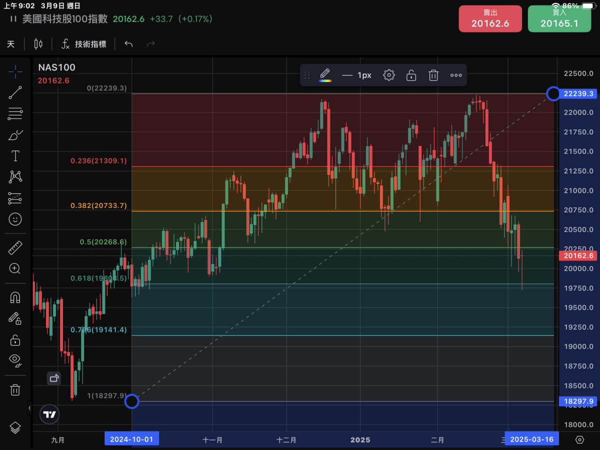 我用斐波那契回撤拉了一下歐元與納斯達克指數,發現他們都已經觸及0.618的回防了