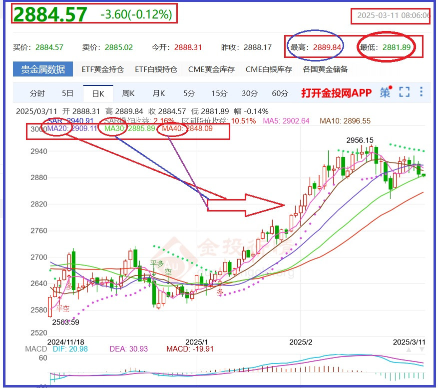 總算跌破第三條MA均線ma20(2909)=並觸及第四條MA30均線(2885)