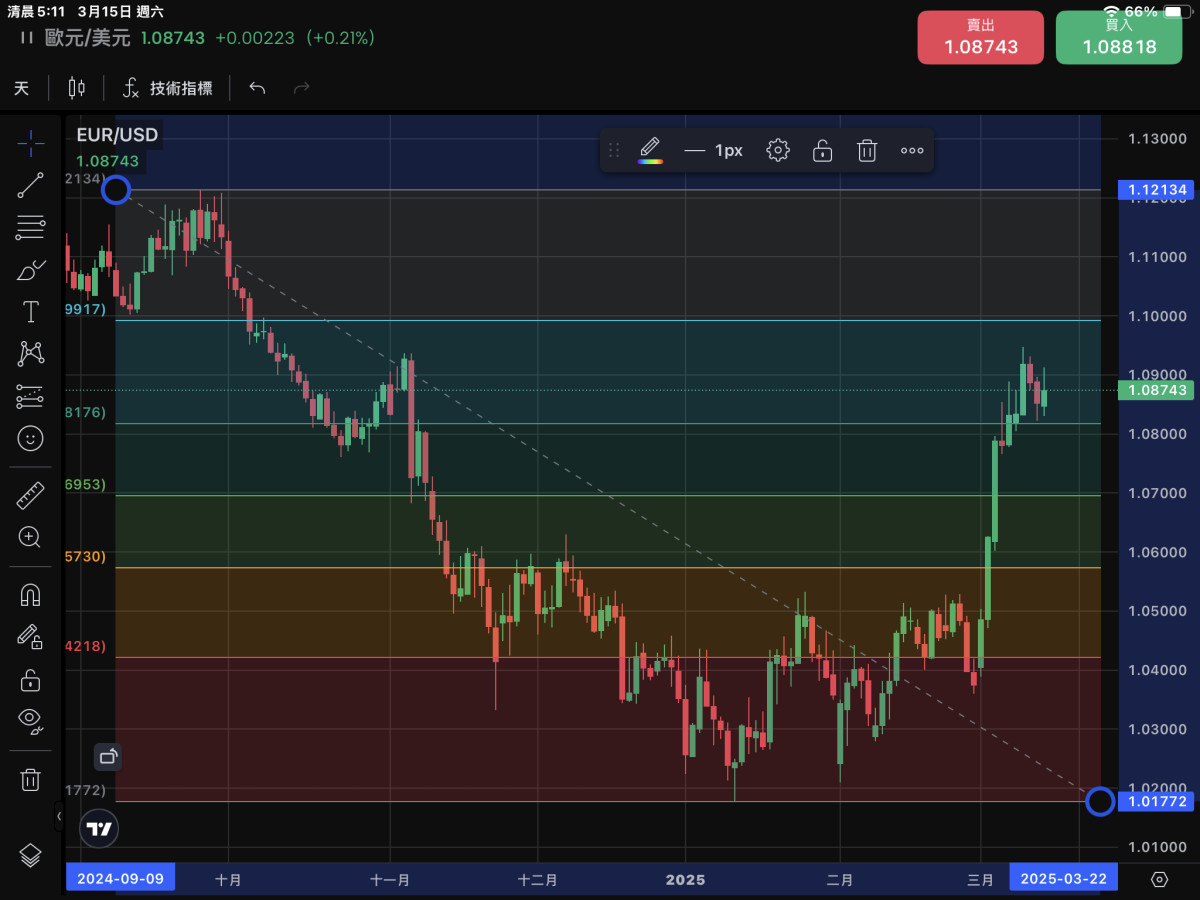 歐/美 通過0.618之後在0.786之前就停下開始回撤,符合回撤線的原則。